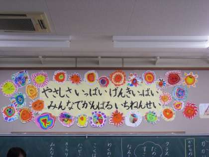1年生は1組も2組も「やさしさいっぱい げんきいっぱい みんなでがんばるいちねんせい」とクラス目標は担任同士の話し合いでそろえています。題字の周りの飾りは子どもたちが描いた絵でできています。もう半年で2年生。時がたつのは早いですね。