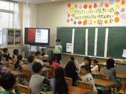 今日はくすのきタイム。決められた学年の子どもたちが他の学年の教室でスピーチを発表します。今回は5年生。9月末〜10月はじめに出かけた「若狭湾少年自然の家」の思い出について,写真等を交えて発表しました。やがて5年生になると出かける長期宿泊学習。目を輝かせて後輩たちも聞いていました。