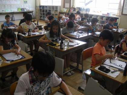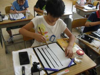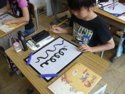 最初に用具の名前や扱い方,書くときの姿勢などを学習しました。