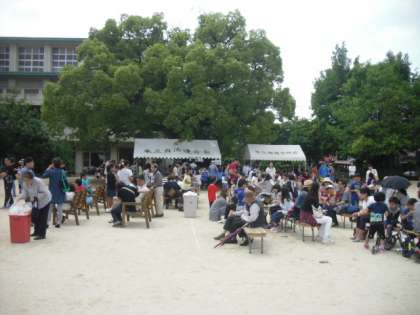 6月5日。運動場で,「ちびっことおとしよりのおたのしみふれあい広場」が開催されました。朱三少年補導をはじめ,多くの地域の方々のお世話により,本日は,小学校の運動場が「おたのしみふれあい広場」と様変わりしました。