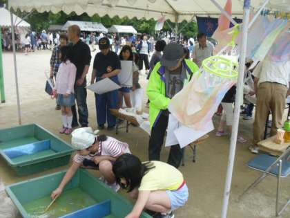 朝から天気が心配されていたのですが,始まってしばらくすると,晴れ間ものぞくようになり,一安心。焼きそばやかき氷,わらび餅,ポップコーン,アイス団子をいただいたり,工作(染め物)や射的といったお楽しみコーナーを回ったり,子どもだけでなく大人も一緒に楽しめる催しでした。