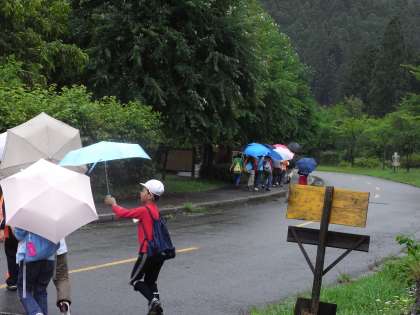 7月14日 雨が降っていましたが,無事山の家に到着。入所式を済ませたあと,雨プログラムで行動しました。体育館に行って,キャンプファイヤーのフォークダンスを練習しました。