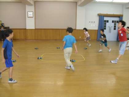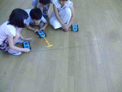 ゴムで動く車を作り,車を輪の中に入れる活動をしました。