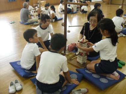 今日は,4年生のさんさん学習(総合的な学習)で,組紐(くみひも)の体験学習を行いました。「京くみひも工業協同組合」から8人の先生においでいただき,京都の伝統工芸品である「組紐」を作る仕事について教えていただいたり,実際に体験させていただいたりしました。子どもたちは真剣な眼差しで組紐作りに取り組み,世界に一つだけの『自分で作った組紐キーホルダー』を作成しました。