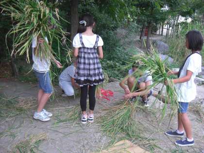 9月13日。本日5年生が稲刈りをしました。今年は大変暑く,早い目の稲刈りとなりました。雀が少し食べた跡がありました。よく実っています。
