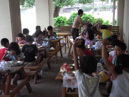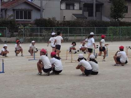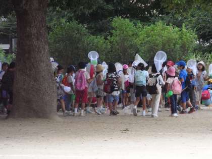 気温がやっと35度を下回りました。9月14日。まだ30度以上ありますが,本日は湿度も少なく,木陰などでは過ごしやすく感じました。野外給食も,「気持ちがいい」と子ども達は食べていました。3年生は,桂川河川敷に昆虫の勉強に行ってきました。たくさんのトノサマバッタ,ショウリョウバッタ,イナゴを捕まえ,トンボやチョウを追いかけました。観察した後は,放してやります。運動会の練習も佳境を迎えてきました。