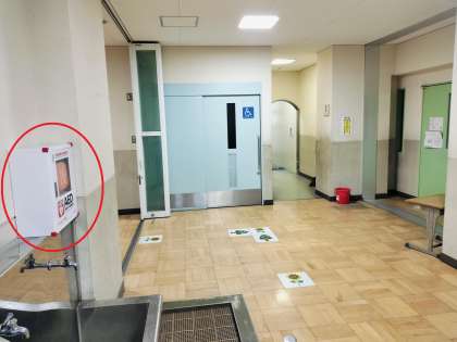 寄贈いただいたAEDは、体育館前の手洗い場の上部に設置しております。