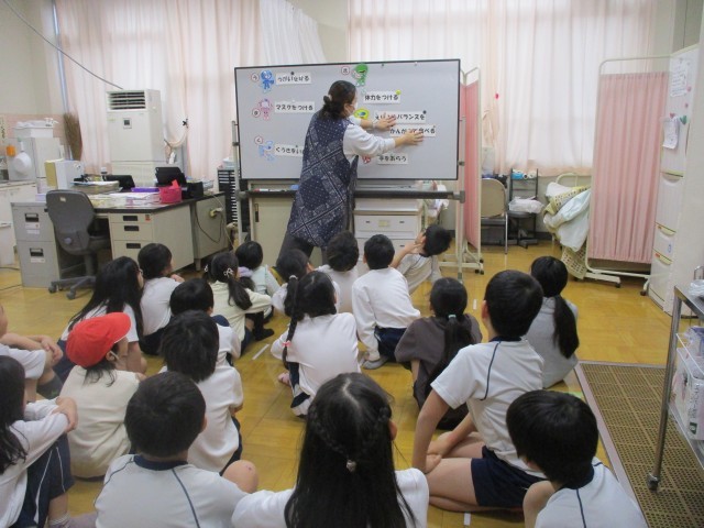 「うまくきたえて」の頭文字に続く風邪の予防に大切な言葉をみんなで確認してから測りました。