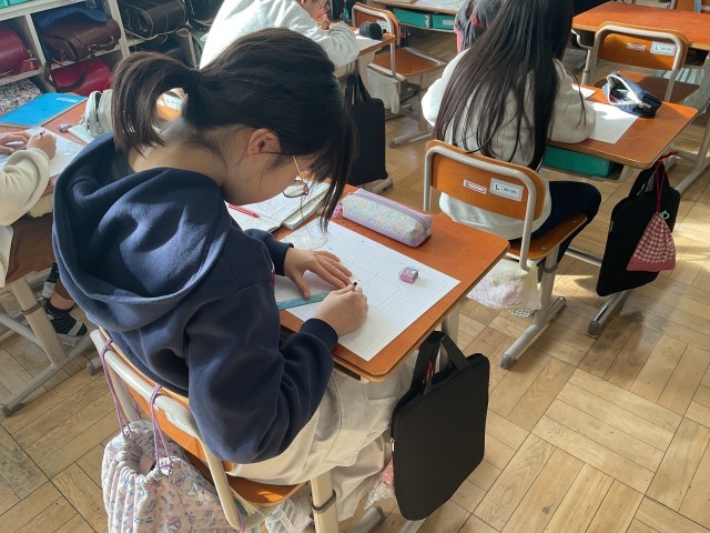 算数学習で三角柱の展開図をかきました。