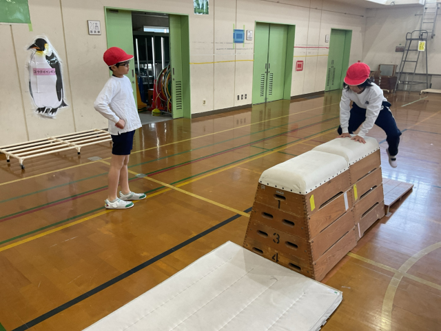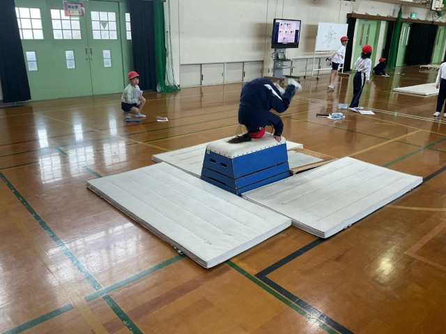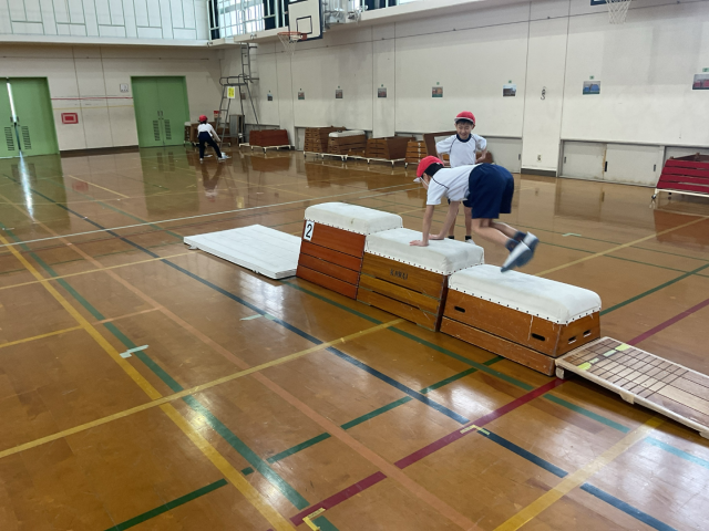 いろいろな場をつくって、とび箱あそびをしました。あそびの中で台上前転やかかえこみ跳びにつながる動きをすることができました。