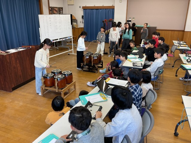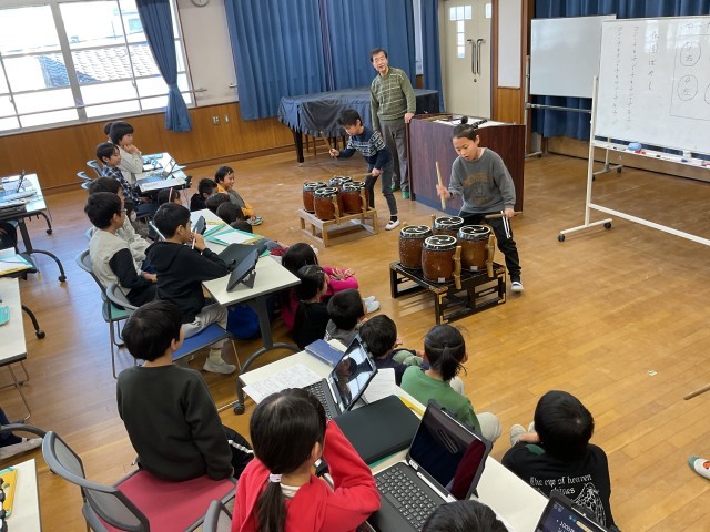 四つ太鼓体験の最後は六斎キッズの子どもたちが太鼓をたたいてくれました。
