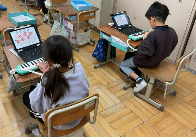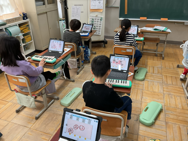 タブレットを使って、自分の名前のひびきから音の高さやリズムを考えました。そして、「ミ」「ソ」「ラ」の3つの音で旋律を考えて鍵盤ハーモニカで演奏しました。