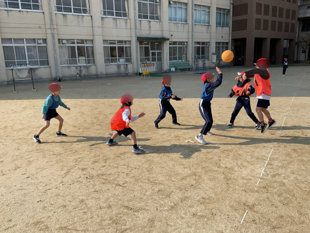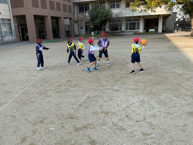 体育科では「パスゲーム」を学習しています。2学期にもパスゲームを学習しましたが、攻撃、守備ともレベルアップしています。ゲーム中にお互い声をかけ合って、味方どうし集まりすぎないようにするなどチームで工夫して学習できました。