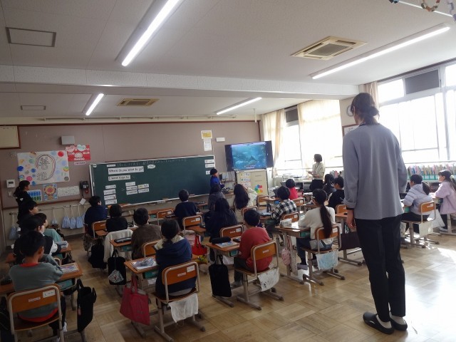 2時間目の5年2組では、外国語科の学習をしていました。今月から着任した新しいALTのサラ・ノア先生に、調べた都道府県の魅力について工夫して伝えていました。