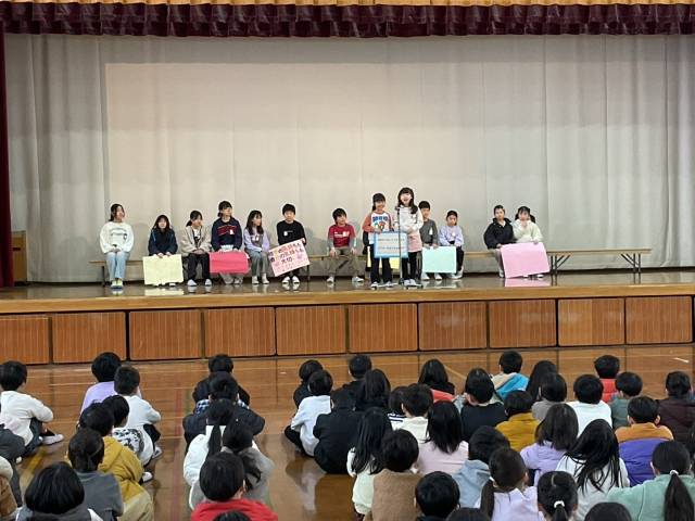 4月に立てた「自分からあいさつをしよう ルール、きまりをまもろう」という人権行動目標のふりかえりを、くすのき集会で学年代表の2名が発表しました。