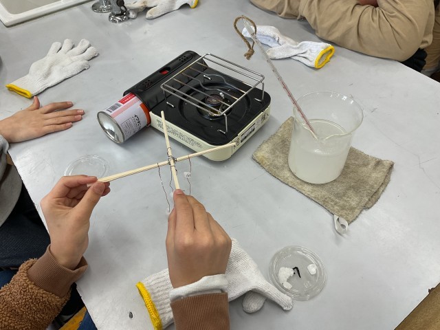 今日は、ミョウバンをたくさん入れた水を火にかけ、ミョウバンの飽和水溶液を作りました。