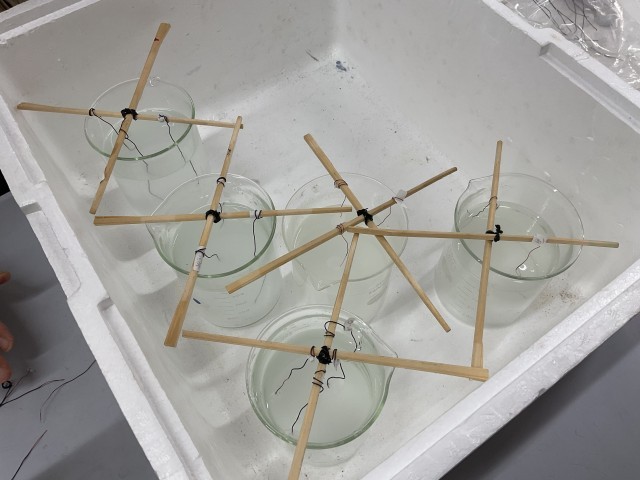 昨日、ミョウバンの結晶に針金をつける作業をしました。