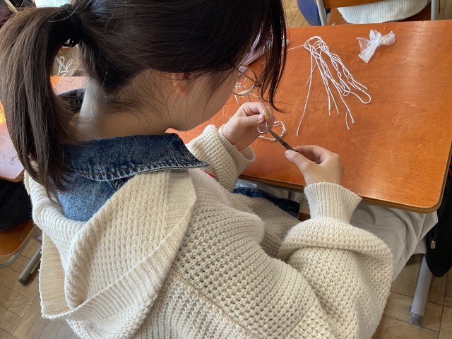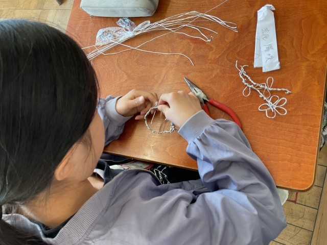 1組も「美しく立つ針金」の完成を目指して活動しています。まずは、しっかりと立たせること。安定感をもたせて立たせた上で、バランスよく針金を巻きつけたり、ねじったり、つなげたりして作品にしていきます。黙々と針金に向き合っています。