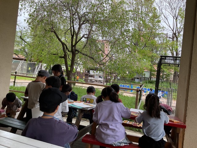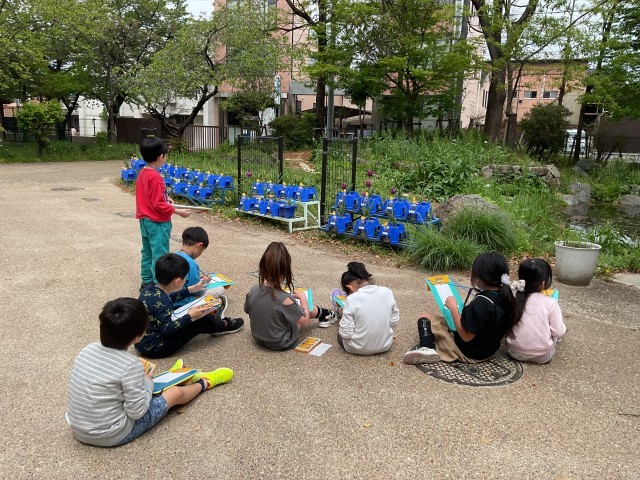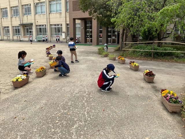 図画工作の学習で運動場に春を見つけに行きました。見つけたものを丁寧に絵に表すことができました。