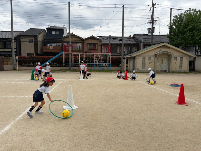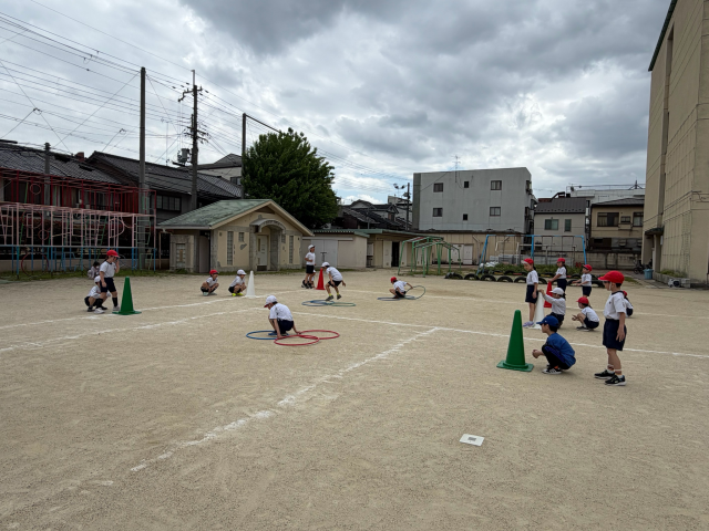 体育の学習では「からだほぐし」の学習を行っています。フラフープやボールを使ってみんなで体を楽しく動かす様子が見られました。