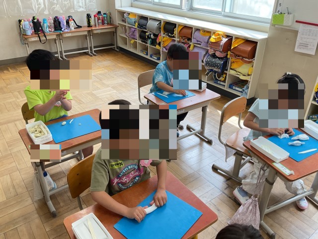 図工でねんどを使って、「自分のごちそう」を作りました。ねんどを丸めたり、握ったりなどいろいろな方法で作りたいごちそうを表現しました。