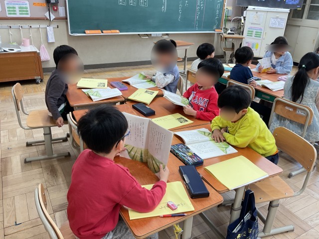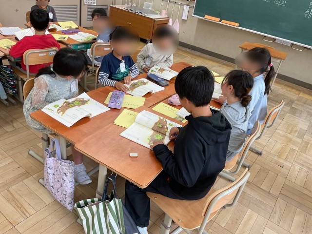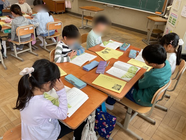 国語の学習ではふきのとうのお話を読んでいます。グループに分かれて音読発表会の練習をしています。
