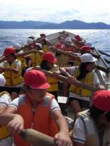 カッター活動が終わります。オールをあげて,オールを立てて,接岸です。子どもたちが...