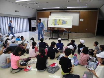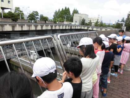 水環境保全センターでは下水道から集められた汚れた水がきれいになっていく過程を,色やにおいなど五感も使い見学しました。