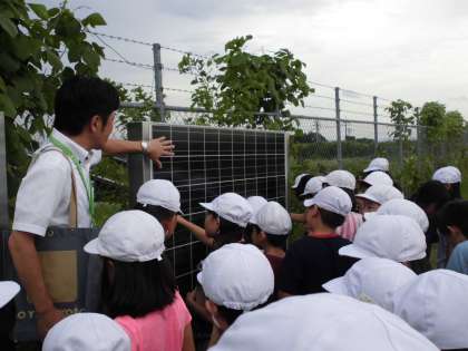 水垂メガソーラーの見学では,朱雀第四小学校の約9倍の敷地にあるソーラーパネルの多さに驚きながら,環境を守るための自然エネルギーについて学習しました。