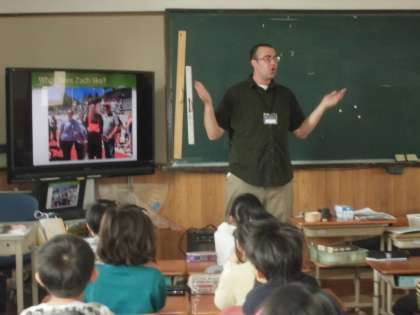 ALTのザック先生との学習が始まりました。ザック先生の自己紹介を聞いて,一人一人の名前カードをもらいました。