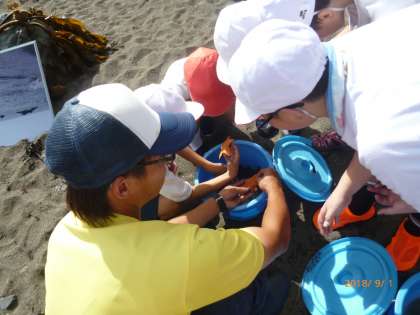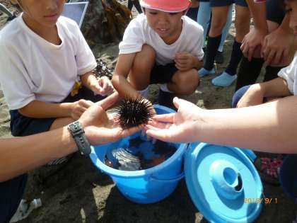 快晴のもと,宮崎浜にて磯観察をしました。前半はマリンランドの職員の方から,潮の満ち引きや,海の生き物についての話を聞き,ヒトデ ナマコ ウニを触る体験もさせてもらいました。初めて触る人もいて,意外とやわらかいとかすべすべ,ぬるぬるとか,触ってみないとわからない感触を体験できました。
