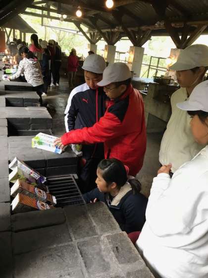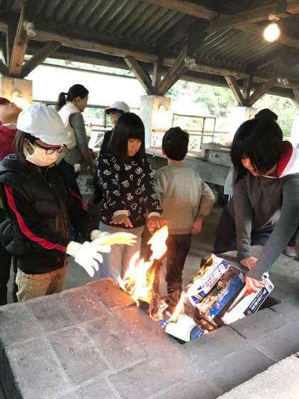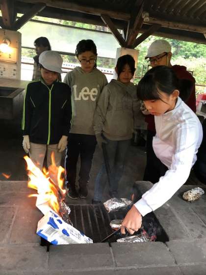 アルミホイルに包んでかまどに入れました。牛乳パックに火をつけるのに少し手間取りましたが、焼けるまでの間、かまどの周りで温まっていました。
