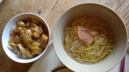 昼食は 塩ラーメンとご飯のセットか 鳥てり丼から選びますが、 塩ラーメンとご飯セットの方に行列ができました 。