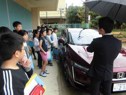 本物の水素自動車や,電気自動車も見学させてもらいました。水素自動車は京都に3台しかないもので,子ども達は興味津々な様子で見ていました。