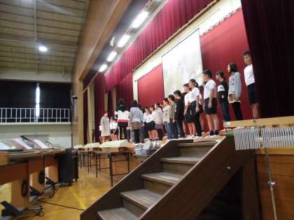 5年生は一番初めの発表ということで,子ども達はとても緊張していました。本番の前には教室で歌の練習をして,最後には学年で「頑張るぞ〜!エイエイオー!!」と気合を入れました。