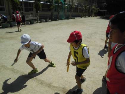 これまでに学習をしてきたバトンパスの練習を生かして,クラス対抗リレーをしました。今回は2組の勝利でした。1組の児童は2組のバトンパスの上手さに驚いていました。お互いに良いところはどんどん学んで成長していきましょう。