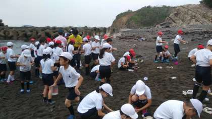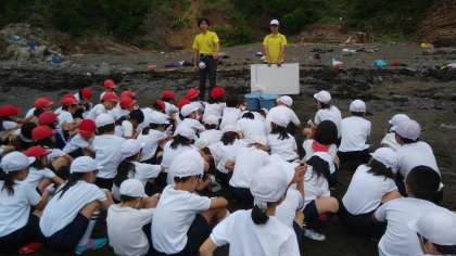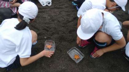磯観察の後半はマリンランドの方に来ていただいて, 潮の満ち引きの仕組みについてのお話を聞きました。ヒトデを使った実験もしました。足だと思っていたところが腕で,腕から足が出ていることを知り,驚きました。