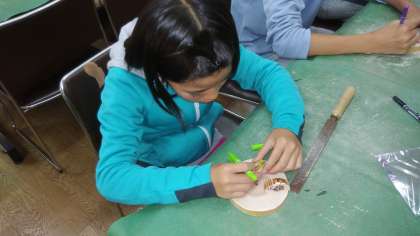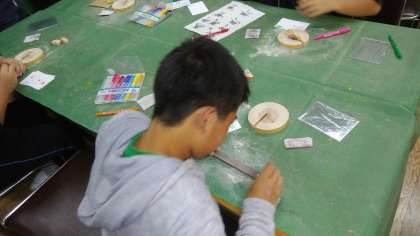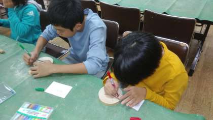 山の家の最後の活動は ウッド 写真立て作りです。 材料の杉を磨いて、 山の家の思い出の絵を書き 、ボンドでつけて出来上がりです 。どんなウッド写真立てができるのか楽しみです