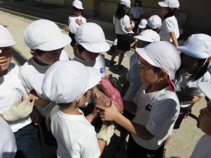 土から少し見えたサツマイモに喜びながら,ていねいにほっていきました。