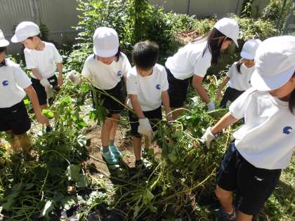 長くなったつるにびっくりしつつ,みんなで力を合わせてつるをひっぱりました。