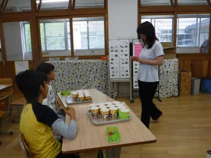 ポップコーンのお店を開いて,先生方に来てもらいました。お店の準備を自分たちで進め,チラシや看板もつくりました。ちょっと緊張しながら先生方にチラシを渡し,宣伝しました。開店すると次々と先生が買いに来られ,「いらっしゃいませ!」と元気よく応対しました。