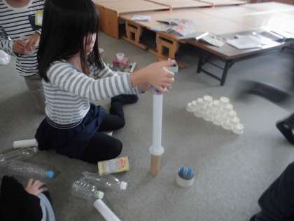 生活科の「あそんで ためして くふうして」で,集めたものでどんな遊びが出来るか色々工夫をして活動しました。