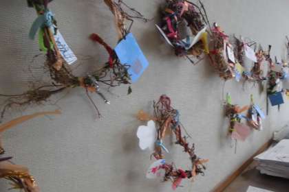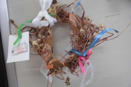 たねができて,すっかり枯れてしまったアサガオ・・・。それでも,そのまま抜いて捨ててしまうのはさみしいな?つるや根っこを使って,何か作ることはできないかなあと話し合いました。話合いの結果,「アサガオでリース」を作ることになりました。学校や家にあったリボンや紐などを使って,すてきなリースが出来上がりました。アサガオの「いのち」を,最後まで大事にすることができました。支柱を抜いたり,植木鉢の整理をしたりすることも,二人組でがんばりました。