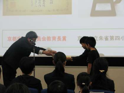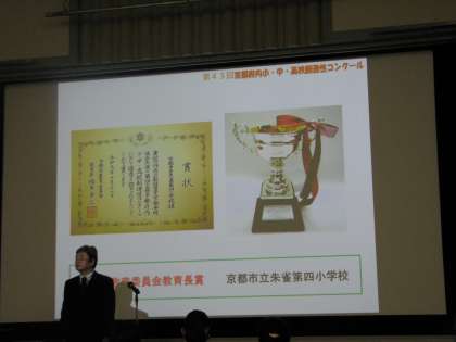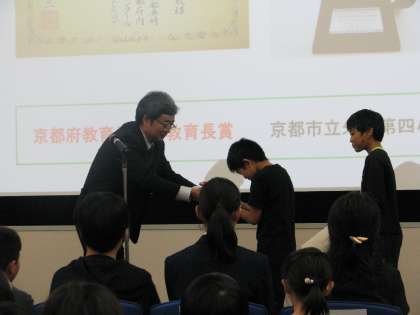 「第43回京都府内小・中・高校創造性コンクール」の授賞式が10月26日(土)京都リサーチパークのサイエンスホールで行われました。朱雀第四小学校は,学校賞として京都府教育委員会教育長賞をいただきました。代表の児童2名が,賞状とカップをいただきました。