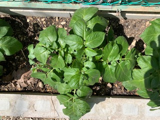 ここ最近夏が来たかのような日差しが強く,暑い日が続いていますね。その日差しを浴びながらすくすくとジャガイモが育ってきています。そうです。前回の問題の正解は,光をたくさん浴びるためにジャガイモの葉は真上を向いています。この暖かい日差しを受けながらみんなの登校を待っていますよ!