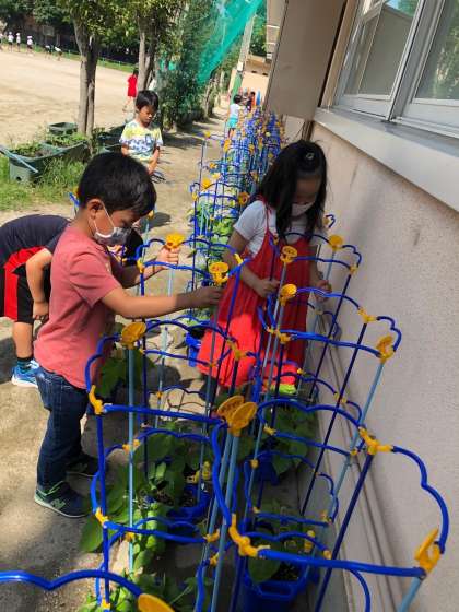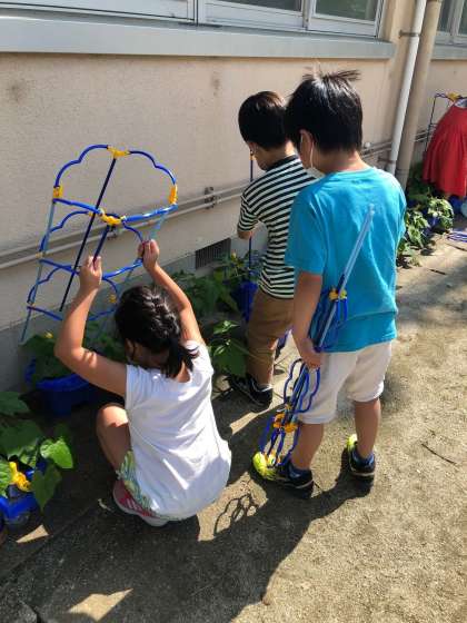つるも伸びてきて,子どもたちと相談して,支柱を立てました。