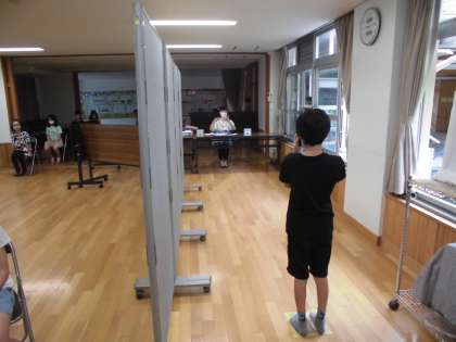 ハンカチを使って目をかくして検査を行いました。