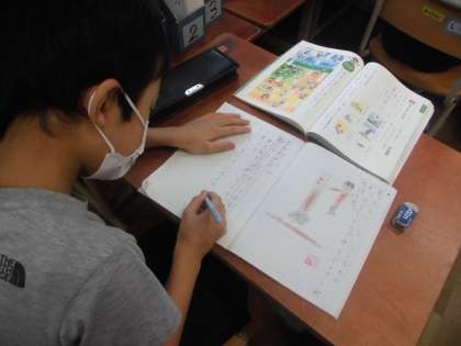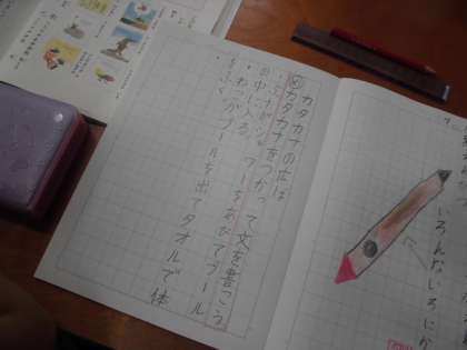 カタカナは1年生から学習してきましたが,2年生では,文章の中で正しく使えるように学んでいます。教科書の絵の中のカタカナの言葉を使って,自分で文章を作りました。主語と述語をはっきりさせて書いたり,カタカタの書き方が間違っていないかに気を付けたりして,文章づくりにチャレンジしました。