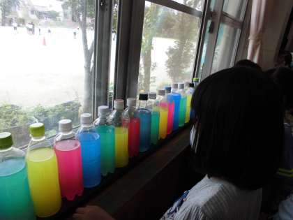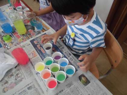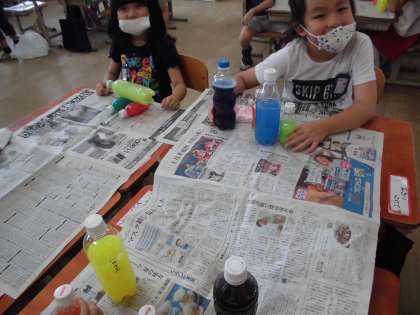 ペットボトルのふたに絵の具をつけて振ると,あら不思議。