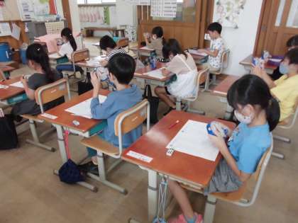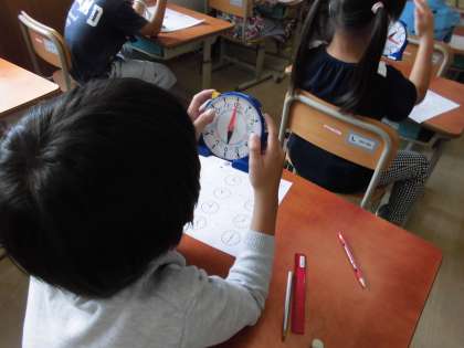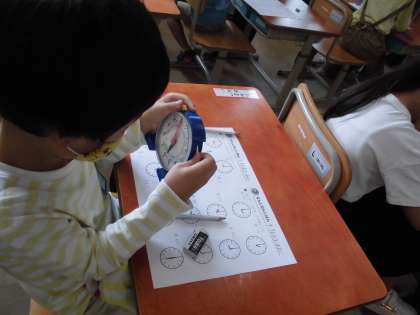 時計の模型を使いながら,「何時かな?」「何時半かな?」と,
